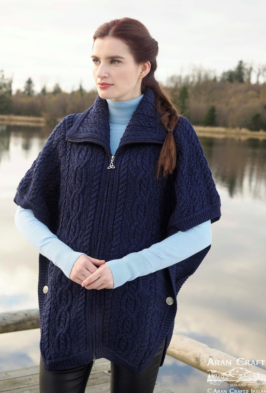Irish Aran funnel neck wool jacket with a celtic knot zip detail. Buttons on...