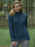 Luxurious ladies cable knit sweater knitted using 100% super soft merino wool. This beautiful ladies cable knit sweater is a mix of a very unique heart design pattern though the body of the sweater and complimented with the traditional honeycomb and cable stitch patterns. The high neck is knitted with the traditional basket stitch design matching the hem beautifully, creating a very feminine and opulent sweater.