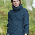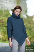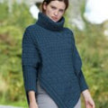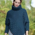 The pattern used throughout this poncho is a mix of the traditional Irish cable, honeycomb and diamond stitches knit in a diagonal pattern for a unique design.