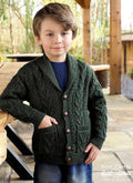 Stylish boys shawl collar cardigan in Aran. This beautiful boys Aran shawl collar cardigan has football buttons and insert pockets. This Aran knit cardigan uses a combination of traditional Irish stitches and is available in Oatmeal & Dark Green.