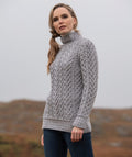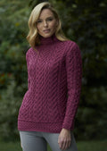 Luxurious ladies cable knit sweater knitted using 100% super soft merino wool. This beautiful ladies cable knit sweater is a mix of a very unique heart design pattern though the body of the sweater and complimented with the traditional honeycomb and cable stitch patterns. The high neck is knitted with the traditional basket stitch design matching the hem beautifully, creating a very feminine and opulent sweater.