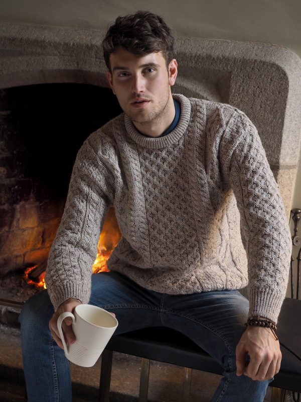 Mens Traditional Irish Aran Fisherman Knit Wool Sweater. This wool sweater is handcrafted in 100% Irish Merino Wool. Available in Charcoal & the Aran traditional natural colour.