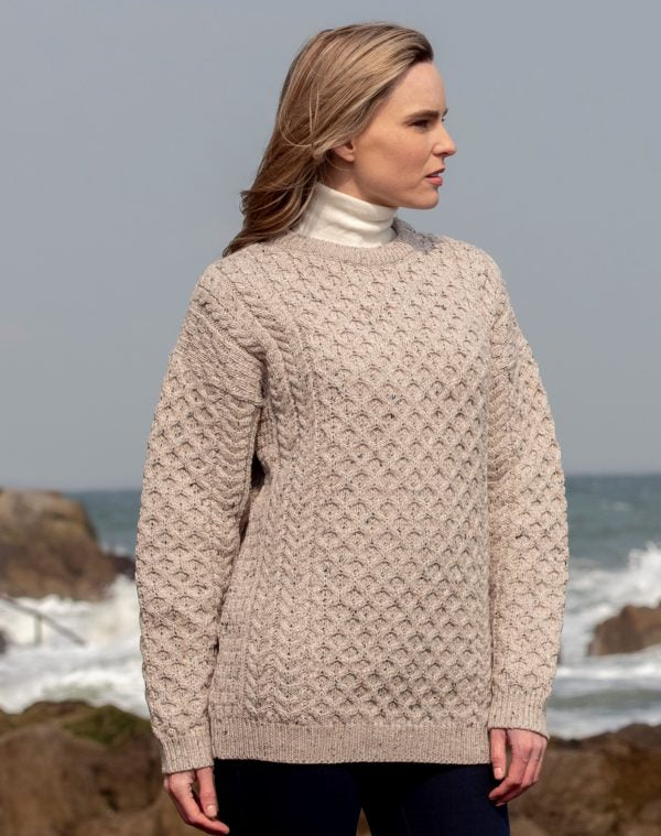This Irish Aran sweater encompasses the honeycomb stitch which is said to be a lucky stitch, signifying abundance and in the case of fishermen a lucky good catch.