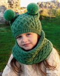 Designed with the traditional trellis cable knit pattern, the addition of the double pom pom’s just add to the cuteness of this adorable Irish hat. I love the matching snood teamed with the hat.